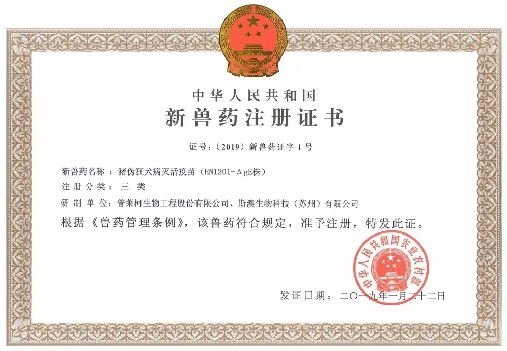 普莱柯、子公司及参股公司获得3个新兽药证书